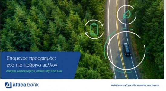 H Attica Bank σού παρέχει τη δυνατότητα να αποκτήσεις το δικό σου οικολογικό αυτοκίνητο, με χρηματοδότηση που ανέρχεται έως και €50.000 για αγορά καινούριου οικολογικού αυτοκινήτου.
