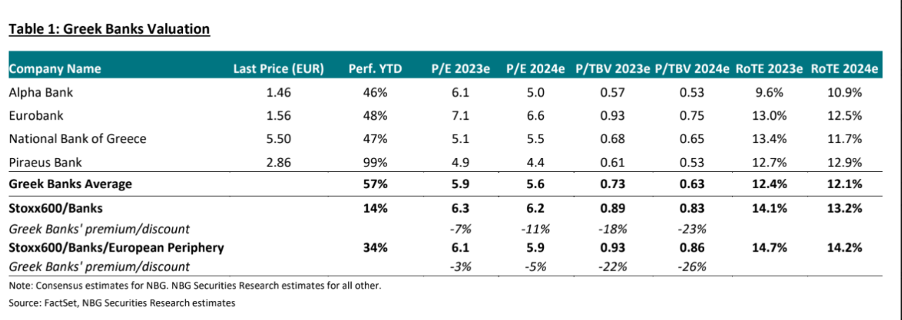 Οι ελληνικές τράπεζες συνολικά παρουσίασαν ένα ισχυρό τρίτο τρίμηνο, με βελτιωμένες τάσεις στον πυρήνα της κερδοφορίας προ προβλέψεων, γεγονός το οποίο αντανακλά κυρίως: α) το όφελος από τις αυξήσεις των επιτοκίων της ΕΚΤ, οι οποίες αντιστάθμισαν τη μείωση του ΝΙΙ λόγω της λήξης του προγράμματος προνομιακού επιτοκίου TLTRO, β) την επέκταση του δανειακού χαρτοφυλακίου με νέες εκταμιεύσεις ύψους άνω των 5,8 δισ. ευρώ, σωρευτικά, και γ) σταθερά λειτουργικά έξοδα σε τριμηνιαία βάση, παρά τον πληθωρισμό, επισημαίνει η NBG Securities.
