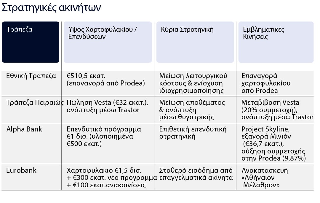 Με διαφορετικές, αλλά συγκλίνουσες ως προς τον στόχο τους πολιτικές, οι τραπεζικοί όμιλοι στην Ελλάδα επανατοποθετούνται δυναμικά στον εγχώριο τομέα ακινήτων με επενδυτικά προγράμματα που συνολικά διαμορφώνονται περίπου στο 1,5 δισ. ευρώ.