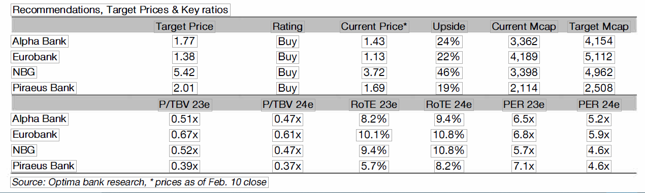 Η προτίμηση της Optima είναι ΕΤΕ σε σχέση με τη Eurobank και την Alpha σε σχέση με την Πειραιώς. Οι τιμές στόχοι είναι 5,42 ευρώ για την ΕΤΕ και περιθώριο ανόδου 46%, Eurobank 1,38 ευρώ και περιθώριο ανόδου 22%, Alpha Bank 1,77 ευρώ και περιθώρια ανόδου και τέλος Τράπεζα Πειραιώς 2,01 ευρώ και περιθώριο ανόδου 19%.