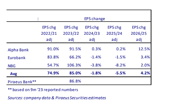 «Αναμένουμε μια ομαλότερη από την προηγουμένως αναμενόμενη πορεία των κερδών ανά μετοχή. Βλέπουμε αρνητικές μεταβολές στα EPS το 2024 και το 2025, και μικρές θετικές το 2026. Οι τράπεζες θα έχουν το χρόνο να υπερασπιστούν την μείωση των NII κατά τη διάρκεια του κύκλου μείωσης των επιτοκίων μέσω νέων χορηγήσεων (για το 2024-2026 μέσος ρυθμός ανάπτυξης των καθαρών χορηγήσεων άνω του 5%), αντιστάθμιση του κινδύνου και τη δημιουργία του χαρτοφυλακίου τίτλων τους (περίπου 30% της καταθετικής βάσης κατά μέσο όρο). Αντισταθμιστικά στοιχεία είναι επίσης η αύξηση των εσόδων από προμήθειες που αναμένεται να καλύψει πάνω από το 50% της μείωσης των NII για τα έτη 2024-2026 και η ομαλοποίηση του κόστους κινδύνου μετά την ολοκλήρωση της της διαδικασίας εξυγίανσης», καταλήγει η χρηματιστηριακή.