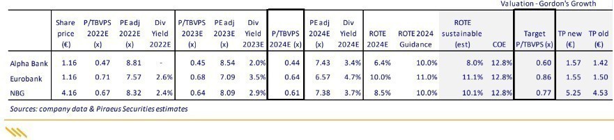 Για να αποτιμήσει η Piraeus Securities τις ελληνικές τράπεζες χρησιμοποιεί δείκτη αποδοτικότητας ROTE 8% για την Alpha Bank, 10% για την ΕΤΕ και 11% για τη Eurobank και ένα κόστος μετοχικού κεφαλαίου (CοE) 12,8% και καταλήγει σε στοχευμένους πολλαπλασιαστές 0,6 φορές για την Alpha Bank, 0,8 φορές για την ΕΤΕ και 0,9 φορές για τη Eurobank. Οι πολλαπλασιαστές στο τέλους του 2024, δίνουν τιμές στόχους 1,57 ευρώ για την Alpha Bank, 1,55 ευρώ για την Eurobank και 5,25 ευρω για την ΕΤΕ. Η αναμενόμενη απόδοση στους μετόχους από την ανατίμηση της τιμής της μετοχής και τη διανομή μερίσματος μπορεί να ξεπεράσει το 30%, εκτιμά η χρηματιστηριακή.