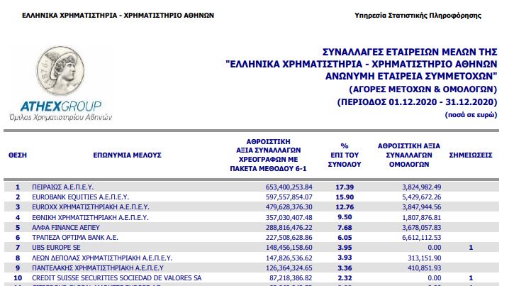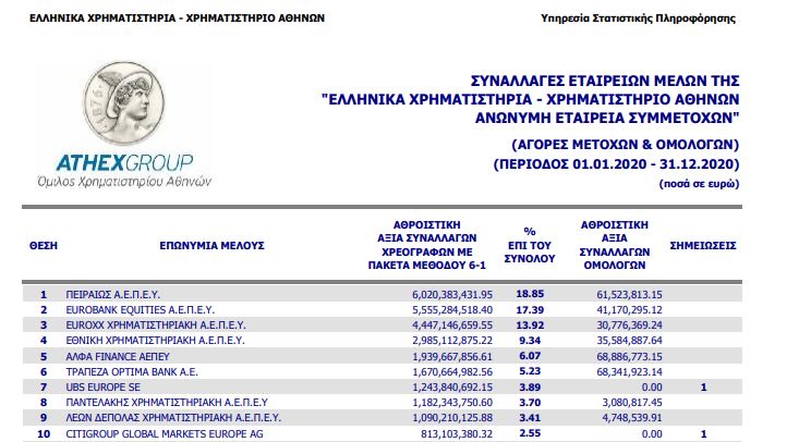 Συγκεκριμένα σύμφωνα με τα στοιχεία του Χρηματιστηρίου Αθηνών, το μερίδιο αγοράς της Πειραιώς ΑΕΠΕΥ στο δωδεκάμηνο του 2020 ανήλθε σε 18,85% επί του συνόλου των συναλλαγών. Στη δεύτερη θέση με ποσοστό 17,39% κατατάχθηκε η χρηματιστηριακή της Eurobank, ενώ τρίτη σε μερίδιο αγοράς στο σύνολο του 2020 ήρθε η Euroxx με 13,92%.