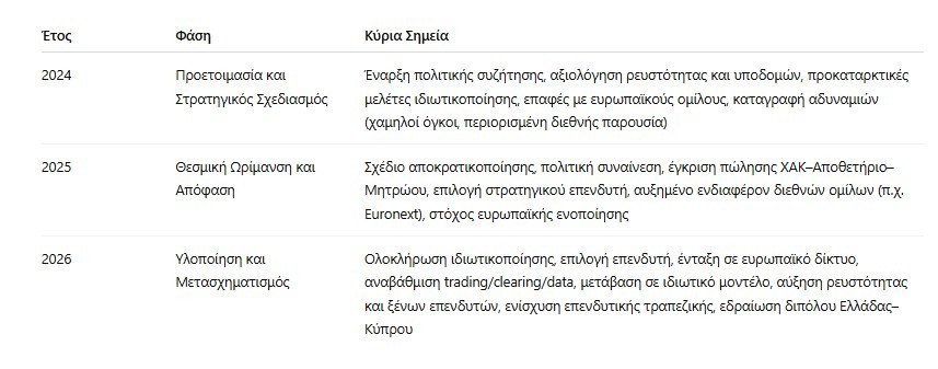 Συνολικά, η ιδιωτικοποίηση του ΧΑΚ δεν αποτελεί απλώς μια μεταρρύθμιση, αλλά ένα σημείο καμπής. Εάν υλοποιηθεί με τον κατάλληλο στρατηγικό εταίρο, μπορεί να μετατρέψει την Κύπρο σε περιφερειακό χρηματοοικονομικό κόμβο και να ενισχύσει τη θέση της Ελλάδας ως βασικού πυλώνα κεφαλαιαγοράς στη Νοτιοανατολική Ευρώπη. Το νέο δίπολο που διαμορφώνεται έχει τη δυναμική να προσελκύσει κεφάλαια, να αυξήσει τις επενδύσεις και να δημιουργήσει μια πιο ανθεκτική και διασυνδεδεμένη αγορά στην ευρύτερη περιοχή.