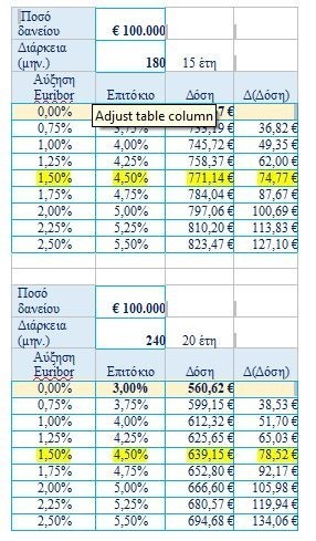 Ποσό Δανείου: €100.000, Διάρκεια: 15 έτη ή 20 έτη. Ενδεικτικό Κυμαινόμενο Επιτόκιο συνδεδεμένο με 3m Euribor πλέον περιθωρίου, έστω σήμερα: 3,00%.