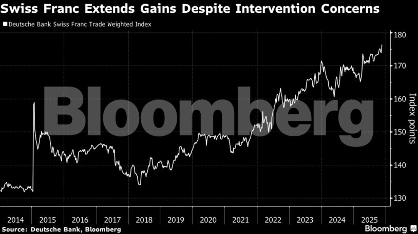 Το φράγκο σημείωσε άνοδο 0,4% στα 0,91862 ανά ευρώ, το υψηλότερο επίπεδό του από τον Ιανουάριο του 2015, όταν η Ελβετική Εθνική Τράπεζα έθεσε τέλος στο ανώτατο όριο της συναλλαγματικής ισοτιμίας στο 1,20. Βρίσκεται σε πορεία για έβδομη συνεχόμενη ημερήσια άνοδο, το μεγαλύτερο ανοδικό σερί από τον Αύγουστο του 2024.