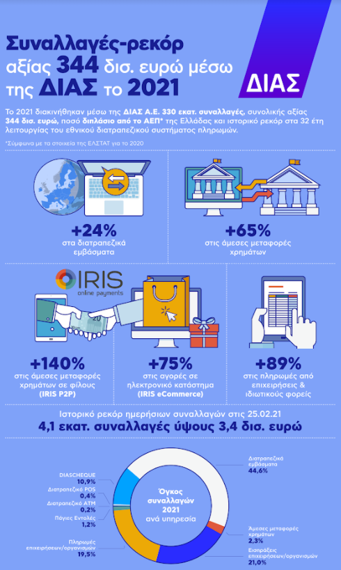 Ιστορικό υψηλό κατέγραψαν οι συναλλαγές που διακινήθηκαν μέσω της ΔΙΑΣ Α.Ε. το 2021, οι οποίες ανήλθαν σε 330 εκατομμύρια σημειώνοντας αύξηση 13% σε ετήσια βάση. Σε όρους αξίας, ανήλθαν σε 344 δισ. ευρώ -ποσό διπλάσιο από το ΑΕΠ της χώρας για το 2020 και ιστορικό ρεκόρ στα 32 έτη λειτουργίας του εγχώριου συστήματος πληρωμών.