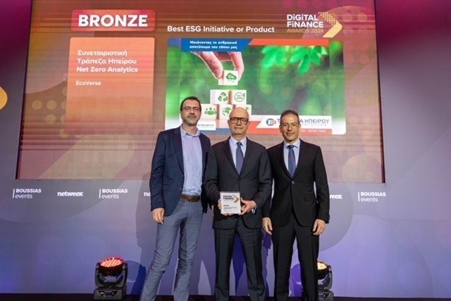 Η Συνεταιριστική Τράπεζα Ηπείρου διακρίθηκε στη φετινή διοργάνωση των Digital Finance Awards με Bronze βραβείο στην κατηγορία Best ESG Initiative or Product για τη χρήση της πλατφόρμας διαχείρισης ESG δεδομένων EcoVerse της Net Zero Analytics. Η επένδυση στην πλατφόρμα EcoVerse προωθεί την υιοθέτηση των κριτηρίων ESG και εντάσσεται στη στρατηγική βιώσιμης ανάπτυξης της Τράπεζας Ηπείρου.