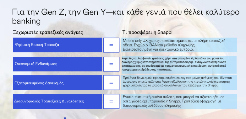 Τα πλεονεκτήματα της Snappi έναντι των άλλων neobanks είναι πως οι εφαρμογές και η εξυπηρέτηση των πελατών γίνεται και στην ελληνική γλώσσα, θα διατίθενται εγχώρια IBAN και μέθοδοι πληρωμής, δεν απαιτούνται καταστήματα και θα προσφέρονται καταναλωτικές πιστώσεις.