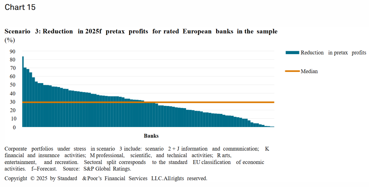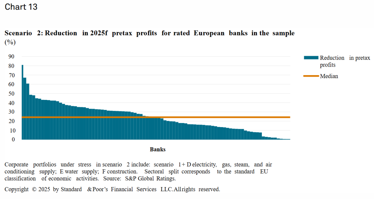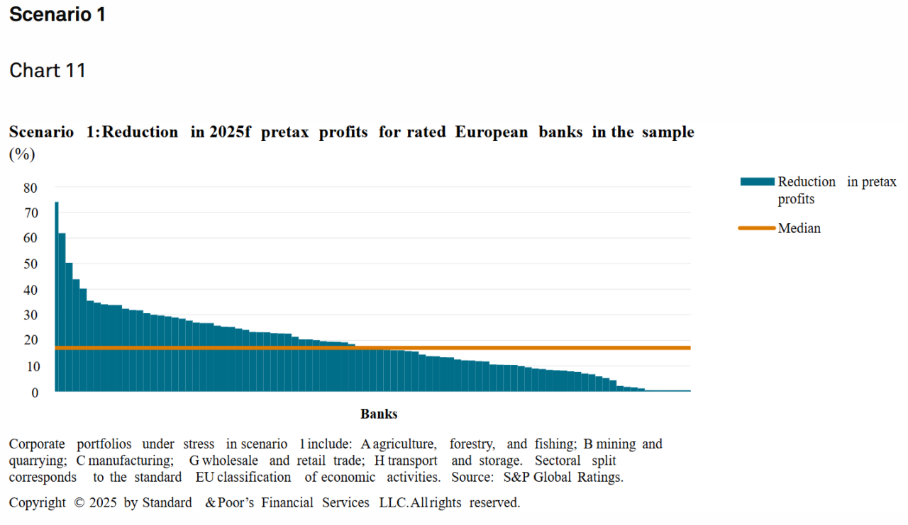 Αυτό που ξεχωρίζει στην παρούσα έκθεση είναι ότι η S&P δεν περιορίζεται σε μακροοικονομικές γενικεύσεις, αλλά πραγματοποιεί ποσοτική προσομοίωση σεναρίων, αξιολογώντας την ικανότητα κάθε τράπεζας να απορροφήσει κλυδωνισμούς στο λειτουργικό της αποτέλεσμα. Με αυτό τον τρόπο, προσφέρει μια πιο χειροπιαστή και συγκρίσιμη εικόνα ρίσκου ανά χώρα και ανά ίδρυμα.