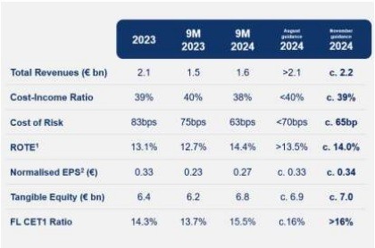 Ας σημειωθεί ότι η εκτίμηση για την τράπεζα είναι πως για το 2024 θα προχωρήσει σε διανομή προς τους μετόχους 35% των κερδών. Mε βάση την ευαισθησία της τράπεζας, για κάθε 25 μονάδες πτώση των επιτοκίων τα έσοδα από τόκους θα μειώνονται 12 εκατ. ευρώ. Στο 9μηνο υπολογίζονται σε 1243 εκατ. ευρώ ενώ οι προμήθειες σε 306 εκατ.ευρώ.