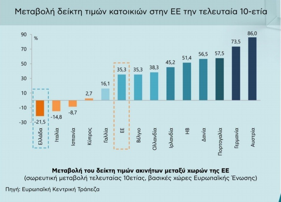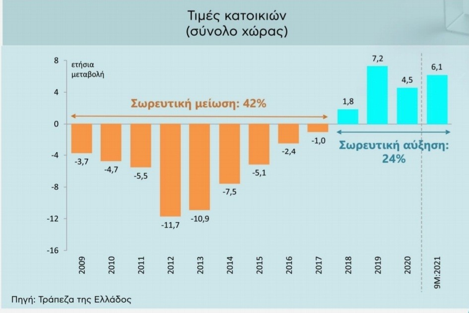 Σύμφωνα με τον Chief Economist, διευθυντή Οικονομικής Ανάλυσης της Εθνικής Τράπεζας, κ. Νίκο Μαγγίνα, η εγχώρια αγορά κατοικίας ανακάμπτει μετά από μία δύσκολη 10ετία, στη διάρκεια της οποίας υπήρξε συρρίκνωση της τάξεως του 42%. Πιο αναλυτικά, οι τιμές αυξήθηκαν κατά 1,8% το 2018, 7,2% το 2019 και 4,5% το 2020, ενώ το 9μηνο του 2021 ενισχύθηκαν κατά 6,1%. Η σωρευτική αύξηση την τελευταία τετραετία «αγγίζει» το 24%. «Λόγω της 10ετούς οικονομικής κρίσης δε, η εγχώρια αγορά αποσυνδέθηκε από τις εξελίξεις σε άλλες χώρες, όπου οι τιμές κατοικιών αυξήθηκαν έντονα», σχολίασε χαρακτηριστικά, σε διαδικτυακή εκδήλωση της ΕΤΕ, με θέμα «Μήπως ήρθε η ώρα να αποκτήσετε και εσείς το δικό σας σπίτι; Τάσεις και προοπτικές της ελληνικής αγοράς κατοικίας», για να προσθέσει: «Παρά την αυξητική τάση την περίοδο 2018 – 2021 οι τιμές παραμένουν περίπου 30% χαμηλότερα από την κορύφωση της αγοράς το γ’ τρίμηνο του 2008. Αντιθέτως, στην Ευρωπαϊκή Ένωση αυξήθηκαν κατά 35% την τελευταία 10ετία». Ειδικότερα. τα… σκήπτρα της αύξησης κράτησε η Αυστρία, με τον δείκτη τιμών να εμφανίζεται ενισχυμένος κατά 86%, ακολουθούμενη από την Γερμανία, με αύξηση 73,5%. Την πεντάδα συμπληρώνουν οι Πορτογαλία, Δανία και Ηνωμένο Βασίλειο με δείκτη στο +57,5%, +56,5% και +51,4% αντίστοιχα.