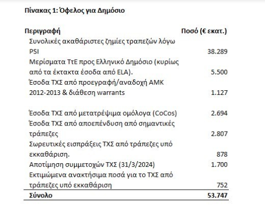 Το κυριότερο όφελος του Ελληνικού Δημοσίου προέρχεται, όπως αναμένεται, από την εθελοντική ανταλλαγή του δημόσιου χρέους (Private Sector Involvement – PSI). Οι συνολικές ακαθάριστες ζημίες του τραπεζικού τομέα στην Ελλάδα από το PSI ανήλθαν σε 38,3 δισεκ. ευρώ (λαμβάνοντας υπόψη και το debt-buy back του Δεκεμβρίου 2012). Επίσης, η Τράπεζα της Ελλάδος διέθεσε υψηλά μερίσματα στο Ελληνικό Δημόσιο, τα οποία σε μεγάλο βαθμό προέρχονταν από τα έσοδα από την παροχή έκτακτης ενίσχυσης ρευστότητας (Emergency Liquidity Assistance) προς τις τράπεζες. Επιπλέον, το Ταμείο Χρηματοπιστωτικής Σταθερότητας (ΤΧΣ) έχει εισπράξει έσοδα (αποπληρωμές και μερίσματα) από τις μετατρέψιμες ομολογίες (CoCos) που είχαν εκδοθεί, από την πρόσφατη επιτυχημένη αποεπένδυσή του από τις σημαντικές τράπεζες στο διάστημα Οκτωβρίου 2023 – Μαρτίου 2024, από τις διανομές των εκκαθαρίσεων τραπεζών που εξυγιάνθηκαν και από άλλες πηγές. Τέλος, στο συνολικό όφελος για τον Έλληνα φορολογούμενο θα έπρεπε να ληφθεί υπόψη και η αποτίμηση των υφιστάμενων συμμετοχών του ΤΧΣ στην Εθνική Τράπεζα της Ελλάδος και στην Τράπεζα Αττικής, καθώς και η προσδοκώμενη ανάκτηση από τις εκκαθαρίσεις τραπεζών που εξυγιάνθηκαν (βλ. Πίνακα 1).