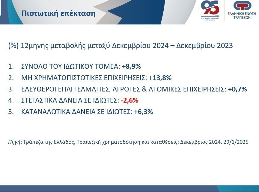 Η πιστωτική επέκταση ενισχύθηκε κατά 9% για το 2024 και με βάση τα στοιχεία της ΤτΕ ενισχύθηκε κατά 9% περίπου στο σύνολο του ιδιωτικού τομέα, κατά 13,8% στις μη χρηματοπιστωτικές επιχειρήσεις, κατά 0,7% σε ότι αφορά τους ελεύθερους επαγγελματίες αγρότες και τις ατομικές επιχειρήσεις και κατά 6,3% σε ότι αφορά τα καταναλωτικά δάνεια σε ιδιώτες.