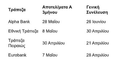 Η Alpha Bank έχει προγραμματίσει την ανακοίνωση αποτελεσμάτων τριμήνου στις 28 Μαΐου ενώ στις 26 Ιουνίου θα πραγματοποιήσει τακτική γενική συνέλευση, η Εθνική στις 8 Μαΐου αποτελέσματα και στις 30 Απριλίου Συνέλευση, η Τράπεζα Πειραιώς στις 30 Απριλίου αποτελέσματα και στις 21 Απριλίου συνέλευση και η Eurobank στις 7 Μαΐου αποτελέσματα τριμήνου και στις 28 Απριλίου συνέλευση.