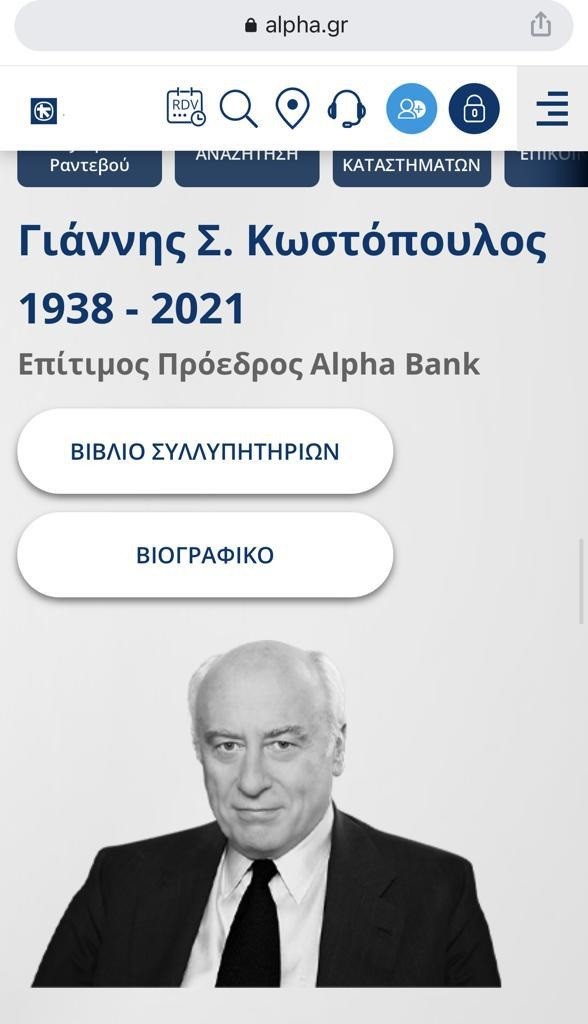 Ο Πρόεδρος και το Δ.Σ. της Alpha Bank ανακοινώνουν με βαθιά λύπη την είδηση του θανάτου του επιτίμου Προέδρου της Γιάννη Κωστόπουλου, ο οποίος υπήρξε εμβληματική μορφή του Ομίλου και αναμορφωτής του ελληνικού Τραπεζικού συστήματος επί πενήντα σχεδόν χρόνια.