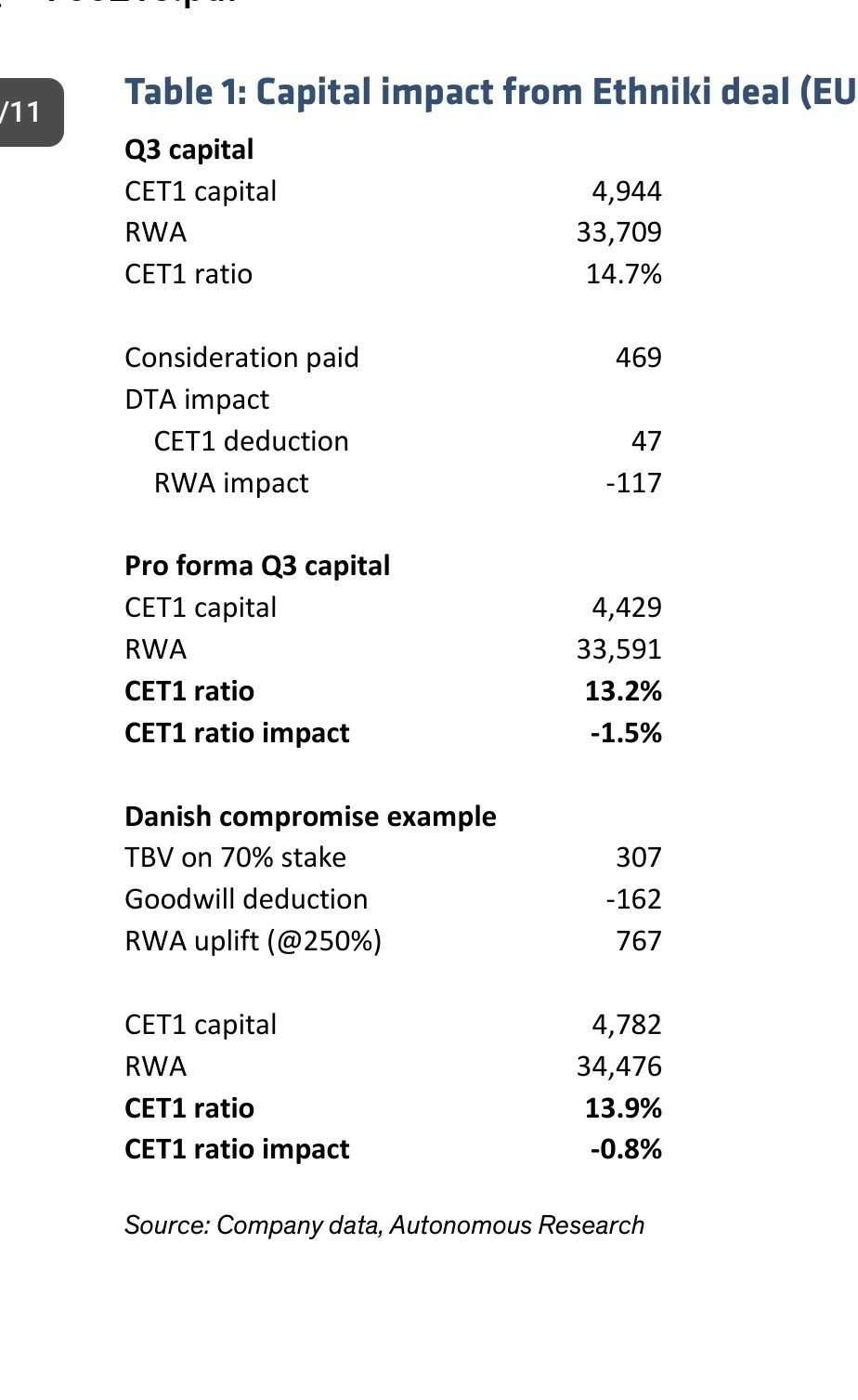 Το πλήγμα στον δείκτη CET1 των 150 μονάδων προκύπτει κυρίως από την αφαίρεση του ποσού που καταβλήθηκε για την αγορά από τα κεφάλαια CET1 (καθώς θα φύγει από το πεδίο των τραπεζικών δραστηριοτήτων) και σε μικρότερο βαθμό από τη μείωση του κατώτερου ορίου CET1 για τη συμπερίληψη των αναβαλλόμενων φορολογικών στοιχείων στα κεφάλαια (με βάση το όριο 10%).