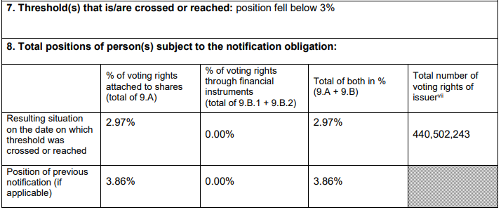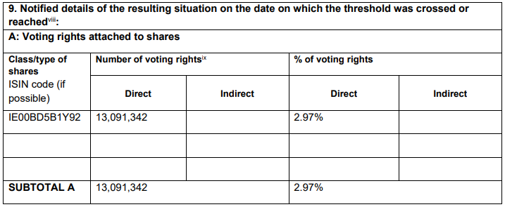 Ειδικότερα, σύμφωνα με τα στοιχεία που κοινοποίησε η εισηγμένη στο Χρηματιστήριο Αθηνών, το ποσοστό των δικαιωμάτων ψήφου της Caius Capital LLP διαμορφώνεται πλέον σε 2,97%, από 3,86% που κατείχε προηγουμένως.