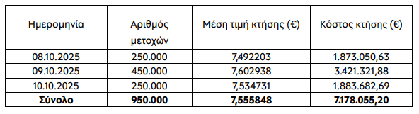 Η «Πειραιώς Financial Holdings A.E.» (η «Εταιρεία»), σε συνέχεια της από 29.09.2025 ανακοίνωσής της σχετικά με την έναρξη εφαρμογής του Αρχικού Σκέλους του Προγράμματος Επαναγοράς Ιδίων Μετοχών («Πρόγραμμα»), που εγκρίθηκε με την απόφαση της Τακτικής Γενικής Συνέλευσης των Μετόχων της Εταιρείας στις 14.04.2025, όπως τροποποιήθηκε από την Έκτακτη Γενική Συνέλευση της Εταιρείας στις 23.09.2025 και σε συνέχεια της από 26.09.2025 απόφασης του Διοικητικού Συμβουλίου της, ενημερώνει το κοινό ότι κατά το διάστημα 06/10/2025 – 10/10/2025 απέκτησε συνολικά, στο πλαίσιο του Προγράμματος, 950.000 μετοχές εκδόσεως της ιδίας («Ίδιες Μετοχές») που διαπραγματεύονται στο Χρηματιστήριο Αθηνών («Χ.Α.»), με μέση τιμή κτήσης €7,555848 ανά μετοχή και συνολικό κόστος €7.178.055,20.