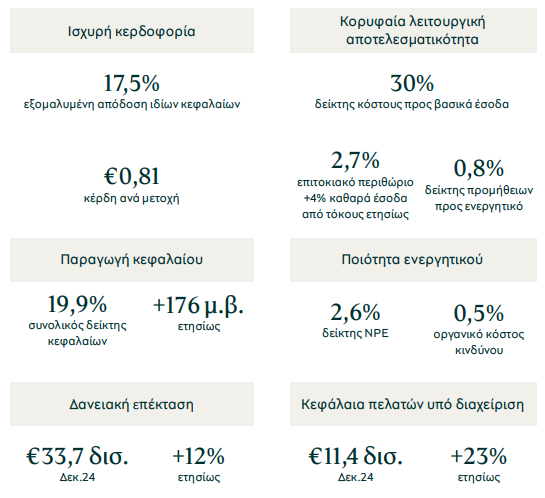 Η εστιασμένη προσέγγιση στη λειτουργική αποτελεσματικότητα διατήρησε τον δείκτη δαπανών προς βασικά έσοδα στο 30% το 2024, παραμένοντας μεταξύ των καλύτερων στην ευρωπαϊκή τραπεζική αγορά. Το κόστος κινδύνου έχει σταθεροποιηθεί σε χαμηλά επίπεδα, στις 21 μονάδες βάσης, ή 46 μονάδες βάσης συμπεριλαμβανομένων προμηθειών, αποτέλεσμα της επιτυχούς διαχείρισης των εισροών νέων NPE. Ο δείκτης NPE βελτιώθηκε περαιτέρω στο 2,6%, ο χαμηλότερος στην αγορά, και η κάλυψη των NPE από προβλέψεις διαμορφώθηκε στο 65%.