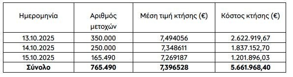 Η «Πειραιώς Financial Holdings A.E.», σε συνέχεια της από 29.09.2025 ανακοίνωσής της σχετικά με την έναρξη εφαρμογής του Αρχικού Σκέλους του Προγράμματος Επαναγοράς Ιδίων Μετοχών («Πρόγραμμα»), που εγκρίθηκε με την απόφαση της Τακτικής Γενικής Συνέλευσης των Μετόχων της Εταιρείας στις 14.04.2025, όπως τροποποιήθηκε από την Έκτακτη Γενική Συνέλευση της Εταιρείας στις 23.09.2025 και σε συνέχεια της από 26.09.2025 απόφασης του Διοικητικού Συμβουλίου της, ενημερώνει το κοινό ότι κατά το διάστημα 13/10/2025 – 15/10/2025 απέκτησε συνολικά, στο πλαίσιο του Προγράμματος, 765.490 μετοχές εκδόσεως της ιδίας («Ίδιες Μετοχές») που διαπραγματεύονται στο Χρηματιστήριο Αθηνών («Χ.Α.»), με μέση τιμή κτήσης €7,396528 ανά μετοχή και συνολικό κόστος €5.661.968,40.