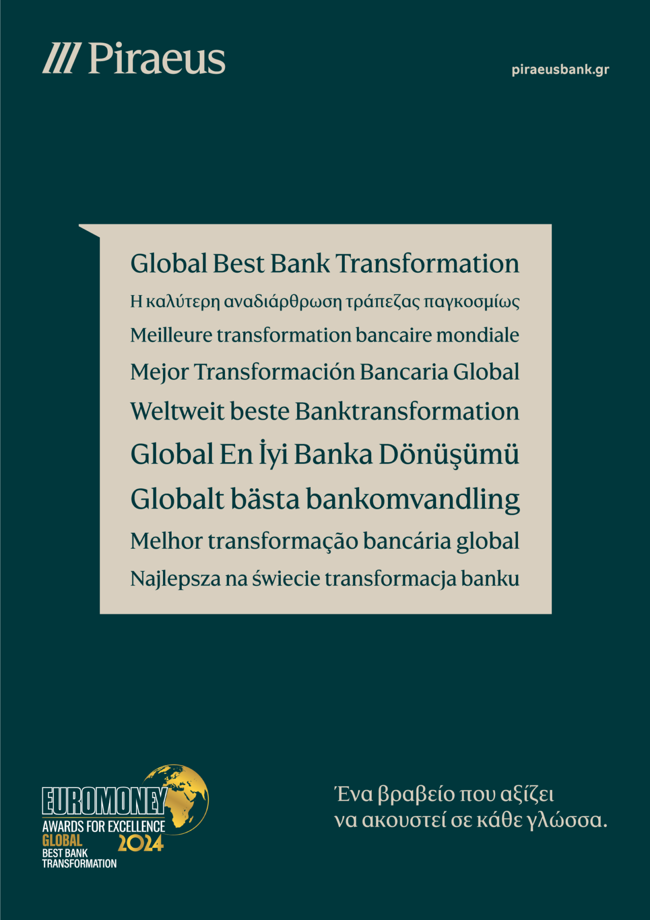 Η Τράπεζα Πειραιώς κατέκτησε τρία σημαντικά διεθνή βραβεία στο πλαίσιο του θεσμού, Euromoney Awards for Excellence 2024. Στην τελετή απονομής που πραγματοποιήθηκε στις 18 Ιουλίου 2024 στο Λονδίνο, η Πειραιώς αναδείχθηκε ως η τράπεζα που πέτυχε την καλύτερη αναδιοργάνωση παγκοσμίως και της απονεμήθηκε το βραβείο “The World’s Best Bank Transformation”.