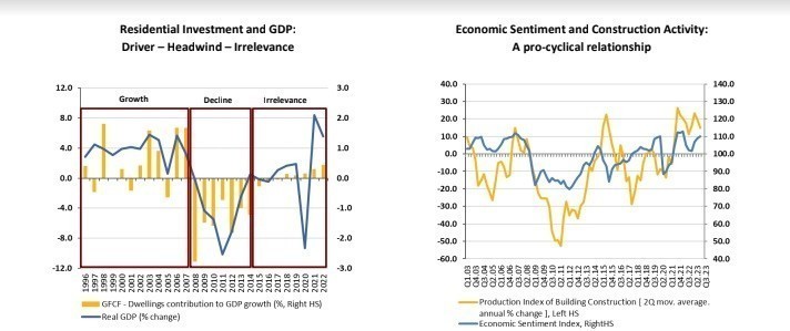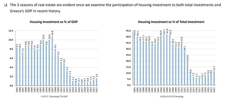 Η μελέτη αναφέρει χαρακτηριστικά: Παίρνοντας τα δεδομένα από την αρχή βλέπουμε ότι η κατακόρυφη πτώση των τιμών ακινήτων αντανακλά πλήρως τόσο τη μείωση του διαθέσιμου εισοδήματος και της κατανάλωσης των ελληνικών νοικοκυριών όσο και την απότομη και αντικυκλική αύξηση της φορολογίας των ακινήτων (δηλαδή την αύξηση της φορολογίας σε μια περίοδο πτώσης των τιμών και των αγοροπωλησιών). Αποτέλεσμα αυτών είναι ο τομέας των ακινήτων από κινητήρια δύναμη της ελληνικής οικονομίας να μεταβληθεί σε ανασταλτικό παράγοντα οικονομικής δραστηριότητας και στη συνέχεια να περάσει στην πλήρη αφάνεια και ασημαντότητα. Ωστόσο οι δυνάμεις της αγοράς παραμένουν σε λειτουργία και η ανάκαμψη των τιμών, παράλληλα με τη βελτίωση των συνθηκών ζήτησης και την άρση των χρηματοδοτικών περιορισμών, έχουν οδηγήσει τόσο σε αύξηση των οικοδομικών αδειών όσο και στην αύξηση των νέων επενδύσεων αυτών καθαυτών.