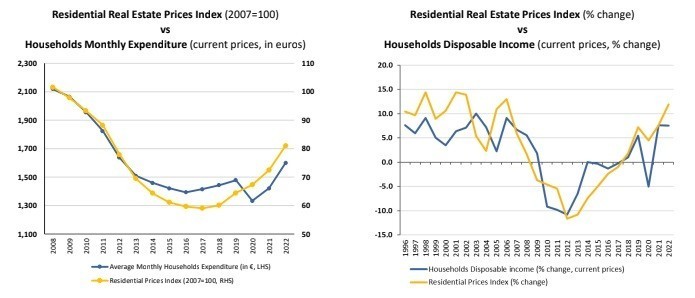 Συνακόλουθα, μεταξύ της απογραφής 2001-2011 καταγράφεται αύξηση του αριθμού των κατοικιών κατά 917 χιλιάδες, ενώ την επόμενη δεκαετία 2012-2022 υπολογίζουμε ότι προστέθηκαν μόνο 155 χιλιάδες. Ταυτόχρονα, από την πλευρά της ζήτησης την περίοδο 2001-2011 καταγράφεται αύξηση του αριθμού των νοικοκυριών κατά 582 χιλιάδες, ενώ από το 2012 έως το 2022 υπολογίζουμε τη δημιουργία μόνο 197 χιλιάδων νοικοκυριών. Επιπρόσθετα όμως ένα νέο χαρακτηριστικό που έχει προκύψει τα τελευταία χρόνια είναι η αύξηση της ζήτησης κατοικιών λόγω βραχυχρόνιας μίσθωσης. Η ζήτηση αυτή, η οποία δρα προσθετικά στη ζήτηση για στέγαση στα εγχώρια νοικοκυριά, ανέρχεται πλέον σε 170 χιλιάδες κατοικίες.