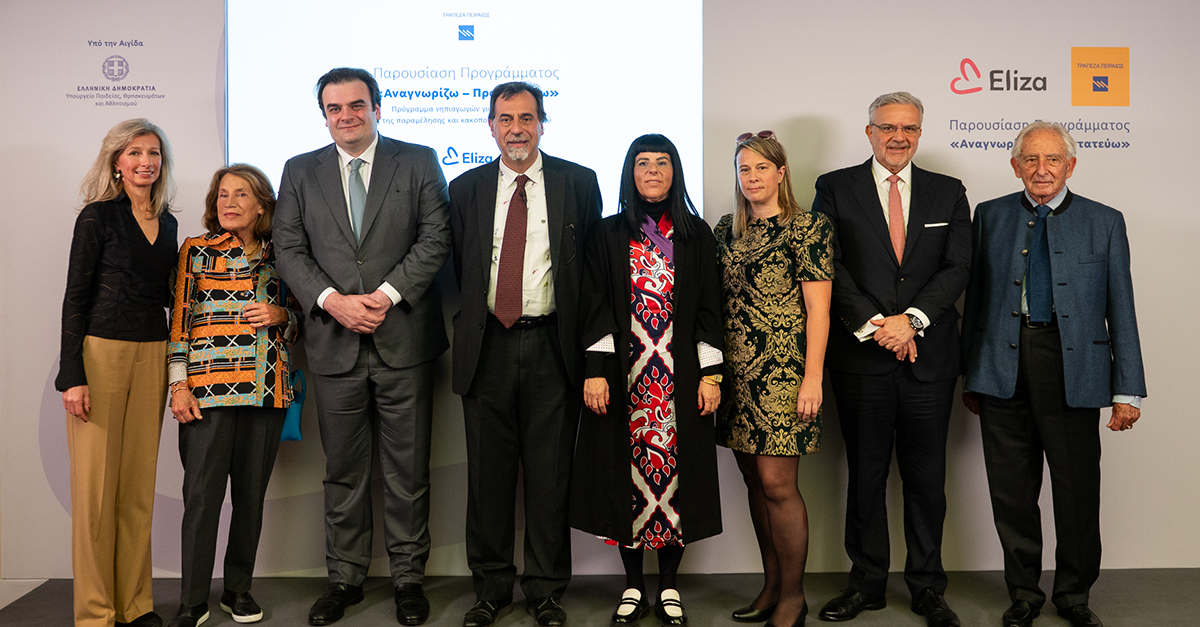 Τη Δευτέρα 20 Νοεμβρίου, παρουσία του Υπουργού Παιδείας, Θρησκευμάτων και Αθλητισμού κ. Κυριάκου Πιερρακάκη, του Διευθύνοντος Συμβούλου της Τράπεζας Πειραιώς, κ. Χρήστου Μεγάλου και των δύο ιδρυτών του Σωματείου Eliza, Πρίγκιπα Μιχαήλ και της κ. Μαρίνας Καρέλλα, Προέδρου του ΔΣ, πραγματοποιήθηκε η παρουσίαση του Προγράμματος «Αναγνωρίζω – Προστατεύω» που υλοποιείται από το Σωματείο Eliza – Εταιρία κατά της κακοποίησης του παιδιού, με στρατηγικό συνεργάτη την Τράπεζα Πειραιώς.