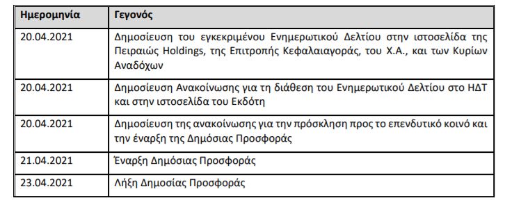 Σημειώνεται ότι το ως άνω χρονοδιάγραμμα εξαρτάται από αστάθμητους παράγοντες και ενδέχεται να μεταβληθεί. Σε κάθε περίπτωση, θα υπάρξει ενημέρωση του επενδυτικού κοινού με σχετική ανακοίνωση της Πειραιώς Holdings.