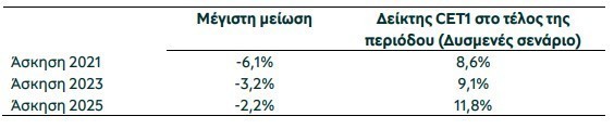 Το δυσμενές σενάριο οδηγεί σε μείωση κατά 222 μονάδες βάσης για την τριετή περίοδο, μετά τη διανομή στους μετόχους της Πειραιώς. Η αντίστοιχη μείωση στην άσκηση προσομοίωσης ακραίων καταστάσεων του 2023 ήταν 241 μονάδες βάσης.