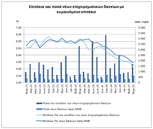 • Το Μάρτιο του 2025, το μέσο σταθμισμένο επιτόκιο των νέων καταθέσεων παρέμεινε σχεδόν αμετάβλητο στο 0,39%, ενώ το αντίστοιχο επιτόκιο των νέων δανείων μειώθηκε στο 4,75%.
