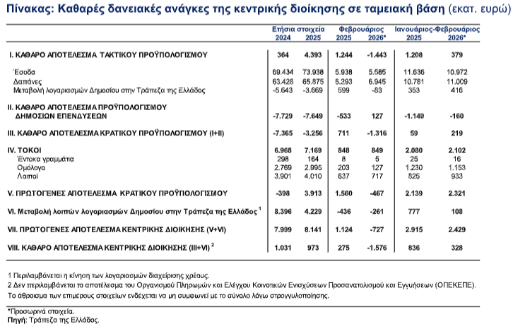 Την περίοδο Ιανουαρίου-Φεβρουαρίου 2026, το ταμειακό αποτέλεσμα της κεντρικής διοίκησης παρουσίασε πλεόνασμα 328 εκατ. ευρώ, έναντι πλεονάσματος 836 εκατ. ευρώ την αντίστοιχη περίοδο του 2025.