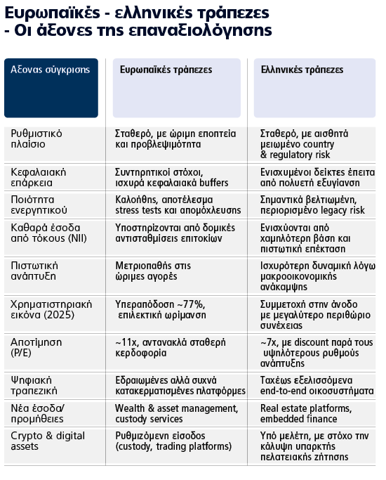 Σε αυτό το περιβάλλον, οι ελληνικές τράπεζες αναδεικνύονται σε ξεκάθαρους πρωταγωνιστές – όχι μόνο λόγω αποτίμησης, αλλά και λόγω στρατηγικής τοποθέτησης σε αυτό που θα μπορούσαμε να ονομάσουμε «νέα τραπεζική».