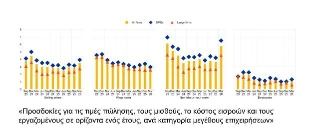 Κατά μέσο όρο, οι επιχειρήσεις ανέμεναν ισχυρότερες αυξήσεις στις τιμές πώλησης και στο μη μισθολογικό κόστος εισροών για τους επόμενους 12 μήνες, ενώ οι προσδοκίες για μισθούς μετριάστηκαν ελαφρώς. Οι επιχειρήσεις ανέμεναν αύξηση τιμών πώλησης κατά 3,5% (από 2,9%), ενώ το κόστος εισροών, συμπεριλαμβανομένης της ενέργειας, προβλεπόταν να αυξηθεί κατά 5,8% (από 3,6%). Αντίθετα, οι προσδοκίες για μισθούς μετριάστηκαν ελαφρώς και αναμενόταν αύξηση 2,8%, από 3,1% το προηγούμενο τρίμηνο.