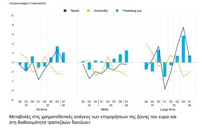 Παρόμοια αύξηση παρατηρήθηκε τόσο για τις μικρομεσαίες επιχειρήσεις (ΜΜΕ) όσο και για τις μεγάλες επιχειρήσεις. Ταυτόχρονα, καθαρό 37% των επιχειρήσεων (από 28% το προηγούμενο τρίμηνο) κατέγραψε περαιτέρω αυξήσεις τόσο στο κόστος άλλης χρηματοδότησης (δηλ. χρεώσεις, προμήθειες και αμοιβές) όσο και στις απαιτήσεις εξασφαλίσεων (καθαρό 14%, αμετάβλητο σε σχέση με το τέταρτο τρίμηνο του 2025).