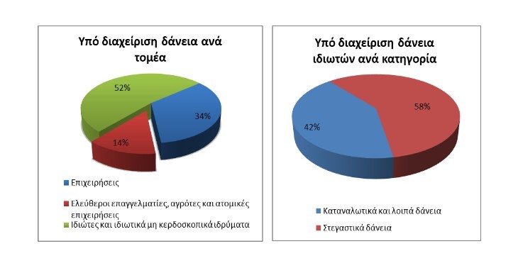 Η ονομαστική αξία των υπό διαχείριση δανείων προς ιδιώτες και ιδιωτικά μη κερδοσκοπικά ιδρύματα αυξήθηκε κατά 918 εκατ. ευρώ έναντι του προηγούμενου τριμήνου και διαμορφώθηκε σε 39.132 εκατ. ευρώ στο τέλος του δ΄ τριμήνου του 2024. Αναλυτικότερα, τα υπό διαχείριση καταναλωτικά δάνεια παρουσίασαν αύξηση κατά 290 εκατ. ευρώ και διαμορφώθηκαν σε 16.050 εκατ. ευρώ. Τα υπό διαχείριση στεγαστικά δάνεια παρουσίασαν αύξηση κατά 604 εκατ. ευρώ και διαμορφώθηκαν σε 22.769 εκατ. ευρώ.