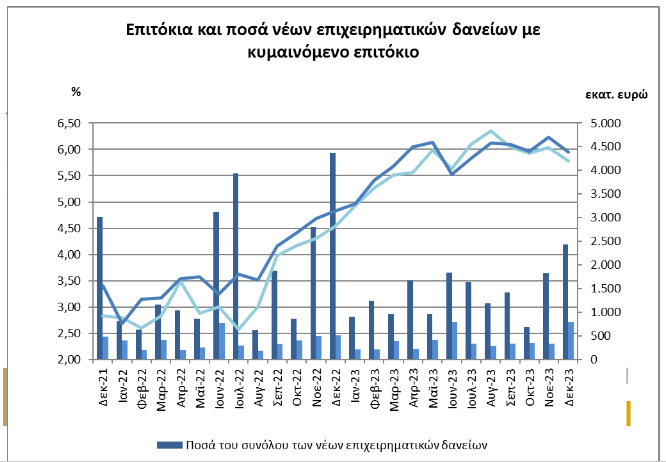 Το μέσο επιτόκιο των νέων επιχειρηματικών δανείων με συγκεκριμένη διάρκεια και κυμαινόμενο επιτόκιο μειώθηκε κατά 26 μονάδες βάσης, το Δεκέμβριο του 2023, και διαμορφώθηκε στο 5,78%. Το μέσο επιτόκιο των δανείων τακτής λήξης με κυμαινόμενο επιτόκιο προς μικρομεσαίες επιχειρήσεις (ΜΜΕ) μειώθηκε κατά 28 μονάδες βάσης και διαμορφώθηκε στο 5,95%.