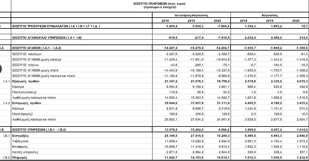 Η μείωση του ελλείμματος του ισοζυγίου αγαθών κατά 468 εκατ. ευρώ σε σχέση με τον Αύγουστο του 2019 οφείλεται ως επί το πλείστον στη μείωση του ελλείμματος του ισοζυγίου καυσίμων, η οποία συνδέεται με την πτώση των διεθνών τιμών του πετρελαίου. Μικρή βελτίωση σημείωσε και το ισοζύγιο αγαθών χωρίς καύσιμα. Σημειώνεται ότι οι συνολικές εξαγωγές αγαθών αυξήθηκαν οριακά σε σταθερές τιμές, ενώ οι αντίστοιχες εισαγωγές μειώθηκαν κατά 11,5%.