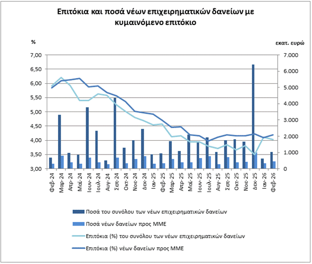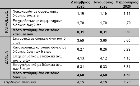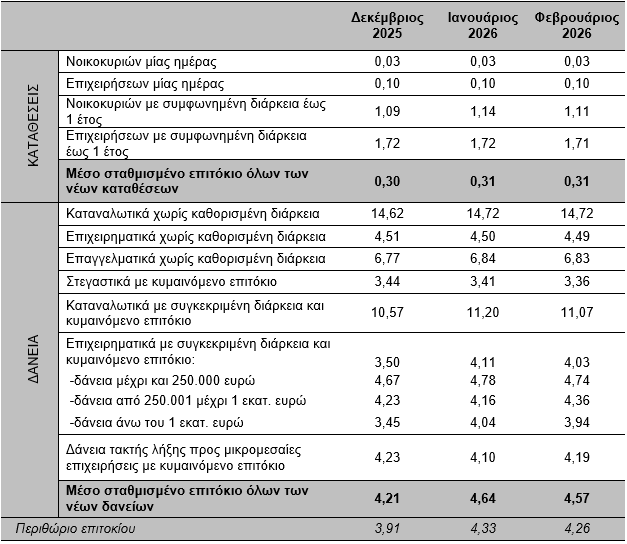 Τον Φεβρουάριο του 2026, το μέσο σταθμισμένο επιτόκιο των νέων καταθέσεων παρέμεινε αμετάβλητο στο 0,31%, ενώ το αντίστοιχο επιτόκιο των νέων δανείων μειώθηκε στο 4,57%.