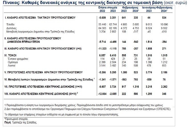 Την περίοδο Ιανουαρίου-Φεβρουαρίου 2024, το ταμειακό αποτέλεσμα της κεντρικής διοίκησης παρουσίασε πλεόνασμα 346 εκατ. ευρώ, έναντι πλεονάσματος 1.299 εκατ. ευρώ την αντίστοιχη περίοδο του 2023. Κατά την περίοδο αυτή, τα έσοδα του τακτικού προϋπολογισμού διαμορφώθηκαν σε 10.696 εκατ. ευρώ, από 9.613 εκατ. ευρώ πέρυσι. Όσον αφορά τις δαπάνες του τακτικού προϋπολογισμού, αυτές διαμορφώθηκαν σε 9.552 εκατ. ευρώ, από 9.524 εκατ. ευρώ την περίοδο Ιανουαρίου-Φεβρουαρίου 2023.