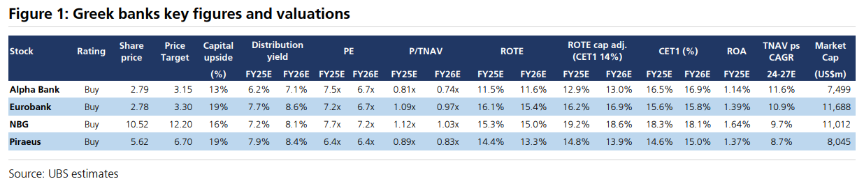Οι αποτιμήσεις αυτές συνεχίζουν να προσφέρουν ελκυστικό σημείο εισόδου, ιδιαίτερα για επενδυτές που αναζητούν υπερβάλλουσες αποδόσεις σε σύγκριση με άλλες ευρωπαϊκές ή αναδυόμενες τραπεζικές μετοχές. Οι τιμές-στόχοι που δίνει η UBS είναι για την Alpha Bank στα €3,15, για τη Eurobank στα €3,30, για την Τράπεζα Πειραιώς στα €6,70 και για την Εθνική Τράπεζα στα €12,20, με περιθώρια ανόδου από 13% έως 19% από τα τρέχοντα επίπεδα και σύσταση «αγορά».