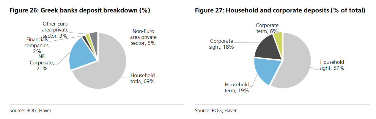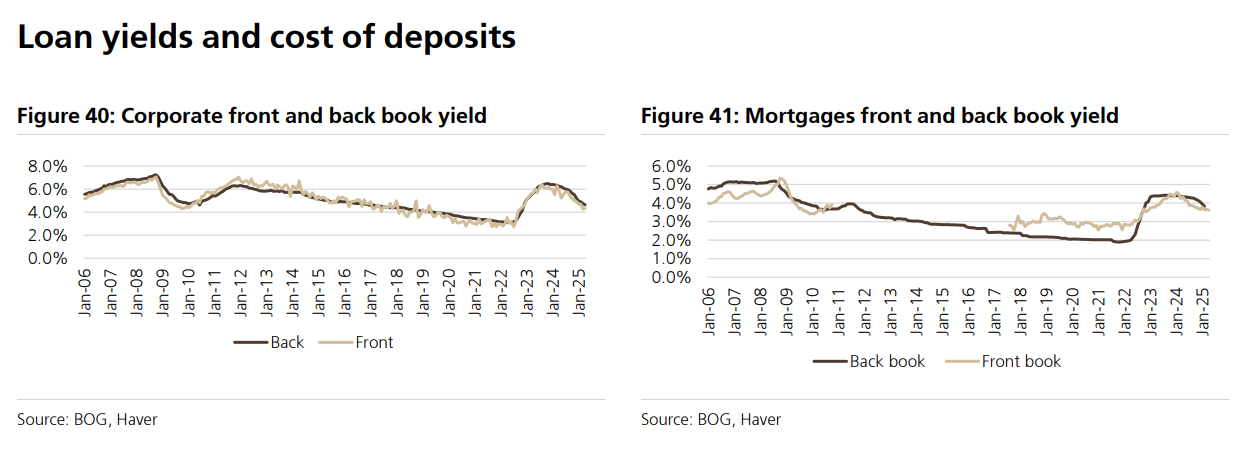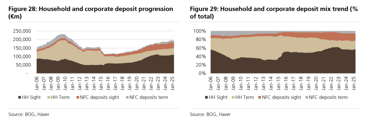 Η ενίσχυση της εταιρικής πίστης αλλά και η σταθερή πορεία των περιθωρίων επιτοκίου (NIM) ενισχύουν την εμπιστοσύνη των τραπεζών στους στόχους για το NII. Οι αποδόσεις του υφιστάμενου χαρτοφυλακίου εταιρικών δανείων υποχώρησαν κατά 12 μονάδες βάσης τον Απρίλιο στο 4,64% (από υψηλό 6,47% τον Οκτώβριο 2023). Την ίδια στιγμή, το κόστος των καταθέσεων ακολουθεί πτωτική πορεία (-3 μ.β. μηνιαία, -9 μ.β. από την αρχή του έτους), διαμορφούμενο στο 0,40%. Η σύνθεση των καταθέσεων παραμένει ευνοϊκή, με τις καταθέσεις όψεως να αποτελούν το 75% του συνόλου, με εξαιρετικά χαμηλό κόστος (μόλις 5 μ.β. για τα νοικοκυριά, 12 μ.β. για τις επιχειρήσεις).