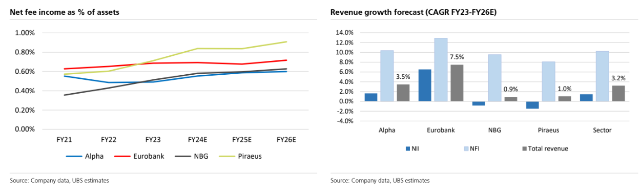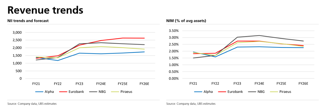 «Διακρίνουμε ισχυρή ικανότητα αύξησης κεφαλαίου και δυνατότητες για διανομές μερισμάτων στους μετόχους σε υψηλότερα επίπεδα από τα σχέδια των τραπεζών, τα οποία θεωρούμε συντηρητικά. Οι ελληνικές τράπεζες βρίσκονται σε θέση για να επωφεληθούν από τον ισχυρό επενδυτικό κύκλο στην οικονομία που ενεργοποιείται από τα ευρωπαϊκά ταμεία RRF της ΕΕ και μια ισχυρή μακροοικονομική ανάκαμψη. Προβλέπουμε ισχυρή πιστωτική επέκταση για την περίοδο 2023 – 2026 και παρά την κορύφωση των καθαρών επιτοκιακών περιθωρίων (NIMs, οι δραστηριότητες αντιστάθμισης παρέχουν σχετική προστασία, καθώς και σταθερή αύξηση των δανείων», προβλέπει ο αναλυτής της UBS.