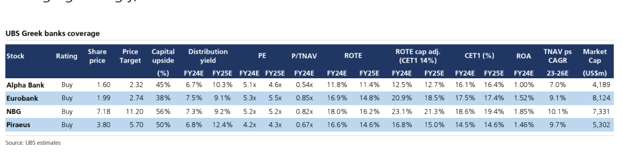 Η UBS εξακολουθεί να διατυπώνει άκρως θετική άποψη για τις ελληνικές τράπεζες, ενώ διατηρεί τις συστάσεις αγοράς και τις υψηλές τιμές στόχους.