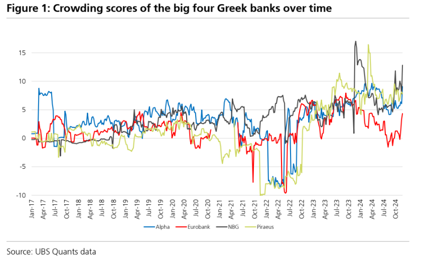 «Παρατηρήσαμε σχετικά χαμηλές επιδόσεις στις τιμές των μετοχών των ελληνικών τραπεζών φέτος παρά τα σταθερά αποτελέσματα, κατά τη γνώμη μας, συμπεριλαμβανομένης μιας ισχυρής απόδοσης το γ’ τρίμηνο. Πιστεύουμε ότι ένας βασικός λόγος είναι οι ανησυχίες της αγοράς σχετικά με την πιθανή πτώση των επιτοκίων γρηγορότερα από το αναμενόμενο και το χαμηλότερο επίπεδο που τελικά οδεύει από ότι πιστεύαμε προηγουμένως. Η τοποθέτηση των επενδυτών αντανακλούσε αυτό, όπως φαίνεται από τη μείωση στις βαθμολογίες συνωστισμού κατά τη διάρκεια του έτους, αν και είδαμε μια ισχυρή ανάκαμψη περισσότερο πρόσφατα», εξηγεί ο οίκος.