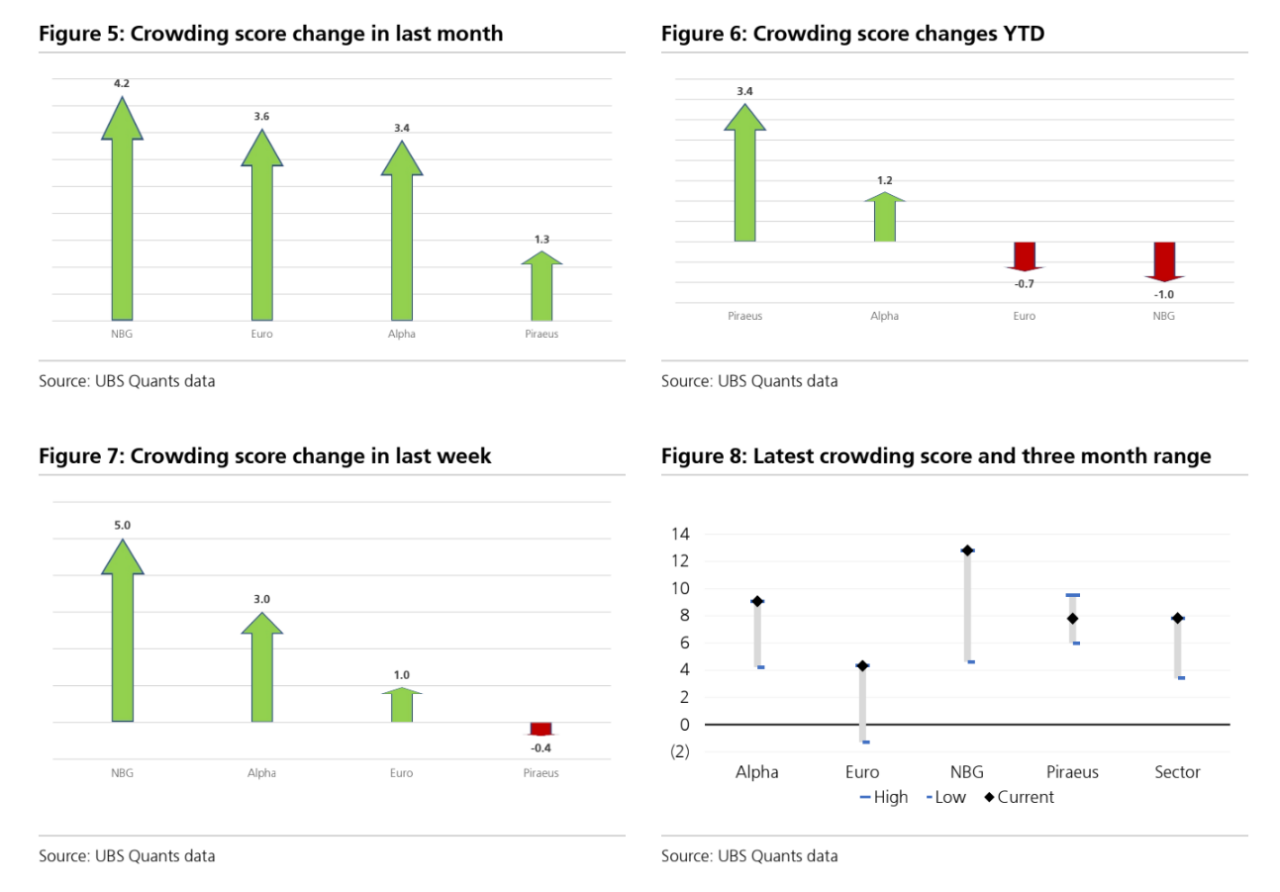 «Οι ελληνικές τράπεζες δεν συγκαταλέγονται μεταξύ των τραπεζών με τον μεγαλύτερο συνωστισμό στην περιοχή. Η ΕΤΕ είναι, επί του παρόντος, η τράπεζα με τον μεγαλύτερο συνωστισμό μεταξύ των τεσσάρων μεγάλων ελληνικών τραπεζών, ακολουθούμενη από την Alpha Bank μετά από μια πρόσφατη μεγάλη αύξηση του συνωστισμού των επενδυτών, ενώ η Τράπεζα Πειραιώς παραμένει επίσης σχετικά συνωστισμένη σε όλη τη διάρκεια του τρέχοντος έτους. Τόσο η Εθνική Τράπεζα, όσο και η Τράπεζα Πειραιώς εξακολουθούν να βρίσκονται πολύ κάτω από τις υψηλές κορυφές που είχαν διαμορφωθεί στο περασμένο έτος. Παρατηρούμε ότι η βαθμολογία της Eurobank συνέχισε να διολισθαίνει σε χαμηλότερα επίπεδα γύρω στο μηδέν κατά τη διάρκεια του έτους, αλλά πρόσφατα ανέκαμψε, καθώς η μετοχή αντέδρασε θετικά στην ανακοινωθείσα εξαγορά των υπόλοιπων μειοψηφιών της Ελληνικής Τράπεζας στην Κύπρο. Ωστόσο, εξακολουθεί να είναι η λιγότερο πολυπληθής μεταξύ των ελληνικών τραπεζών και η μόνη με σημαντική διεθνή στρατηγική ανάπτυξης», επισημαίνει η ελβετική τράπεζα.
