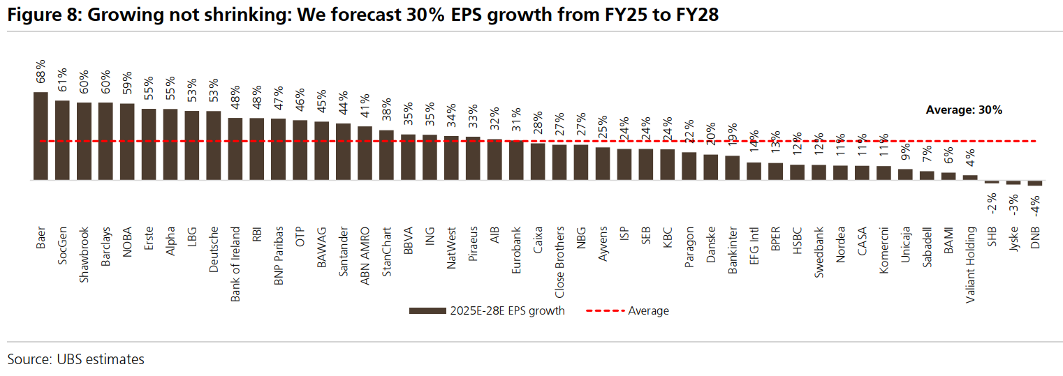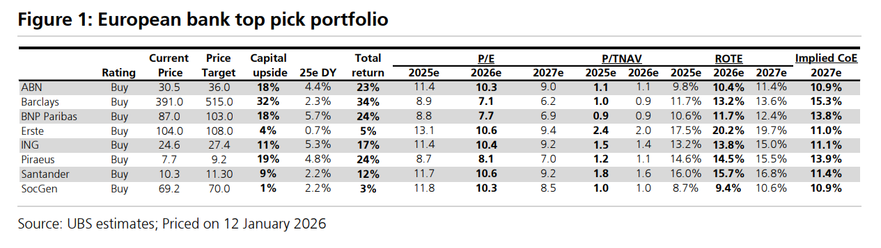 Σε αυτό το πλαίσιο, η UBS διαμορφώνει χαρτοφυλάκιο European bank top picks, στο οποίο περιλαμβάνονται: ABN AMRO, Barclays, BNP Paribas, Erste Group, ING, Santander, Société Générale, καθώς και η Τράπεζα Πειραιώς.