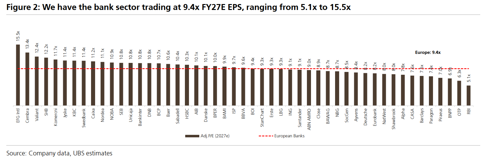 Σε πανευρωπαϊκό επίπεδο, η UBS εμφανίζεται πιο επιφυλακτική σε ό,τι αφορά το sector trade, μετά το ισχυρό ράλι του τελευταίου έτους. Οι ευρωπαϊκές τράπεζες έχουν καταγράψει συνολική απόδοση 77% σε 12μηνη βάση και διαπραγματεύονται πλέον στις 9,4 φορές τα εκτιμώμενα κέρδη του 2027, με ROTE 15%-16%, υπονοούμενο κόστος ιδίων κεφαλαίων 10,2% και διανεμόμενη απόδοση 7% και 8% για το 2026 και 2027 αντίστοιχα.
