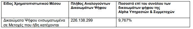 Ειδικότερα, η Αlpha Bank A.E. ενημερώνει το επενδυτικό κοινό ότι, σύμφωνα με την από 12 Νοεμβρίου 2025 γνωστοποίηση της UniCredit S.p.A, την 10.11.2025 αυξήθηκε η συμμετοχή της τελευταίας σε χρηματοοικονομικά προϊόντα, με προεπιλεγμένη μέθοδο τον χρηματικό διακανονισμό και εναλλακτικά τον φυσικό διακανονισμό, τα οποία υπό την αίρεση του φυσικού διακανονισμού και της εξασφάλισης όλων των εποπτικών εγκρίσεων, δύνανται να οδηγήσουν στην απόκτηση επιπλέον 5.859.978 κοινών μετοχών με δικαίωμα ψήφου, που αντιστοιχούν στο 0,253% του συνόλου των δικαιωμάτων ψήφου της Αlpha Bank.